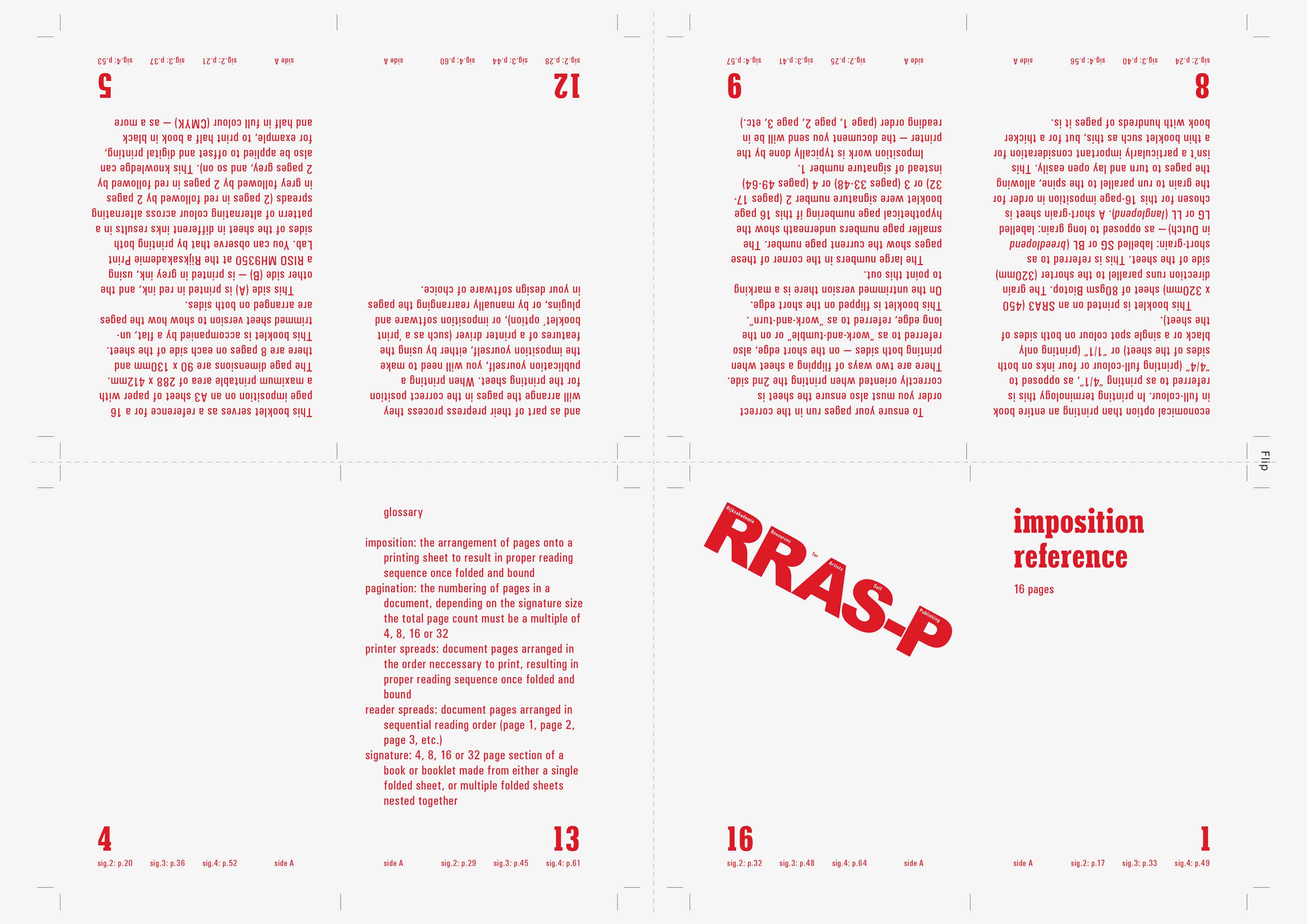 This booklet serves as a reference for a 16 page imposition on an A3 sheet of paper with a maximum printable area of 288 x 412mm. The page dimensions are 90 x 130mm and there are 8 pages on each side of the sheet. This booklet is accompanied by a flat, un- trimmed sheet version to show how the pages are arranged on both sides.