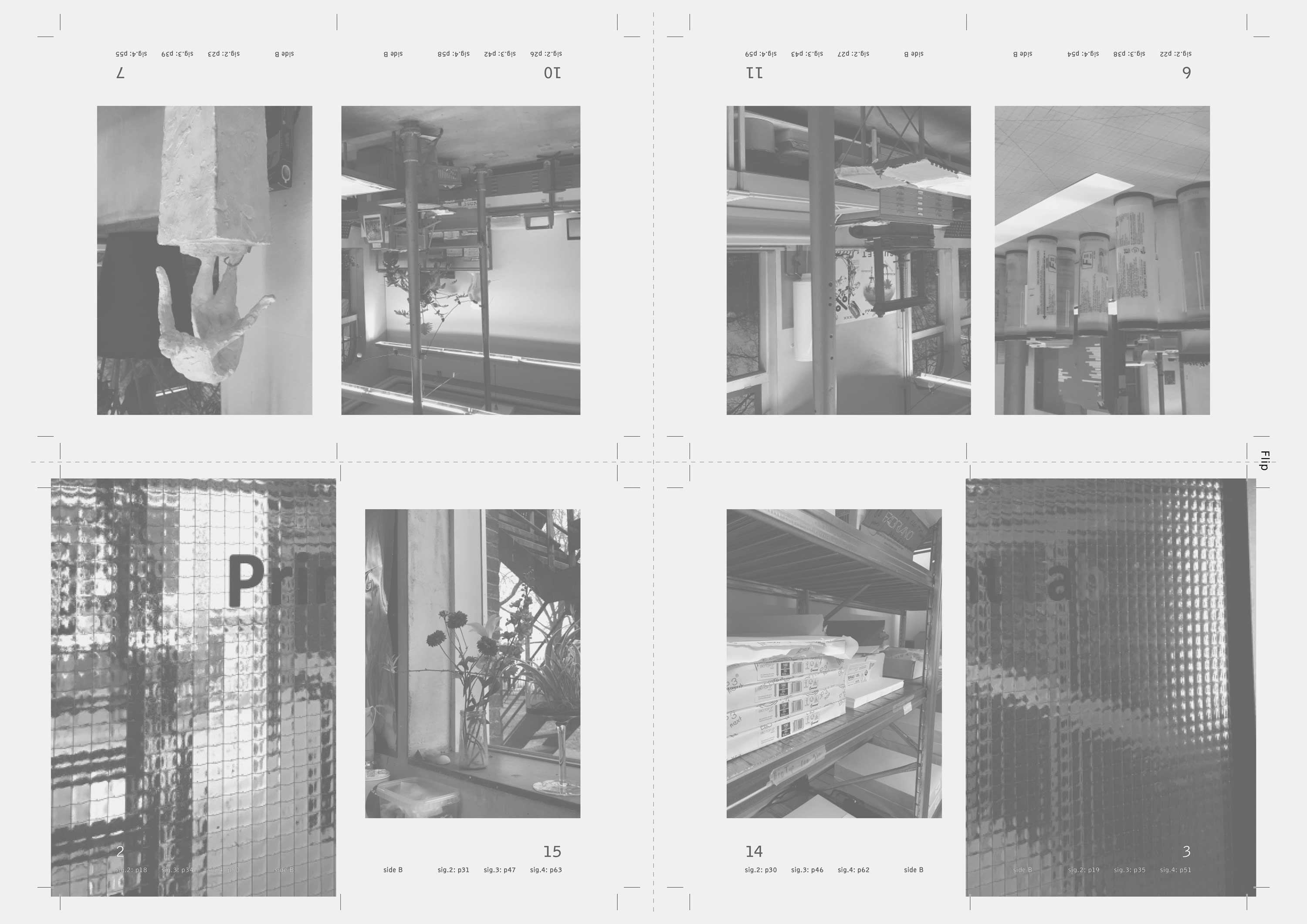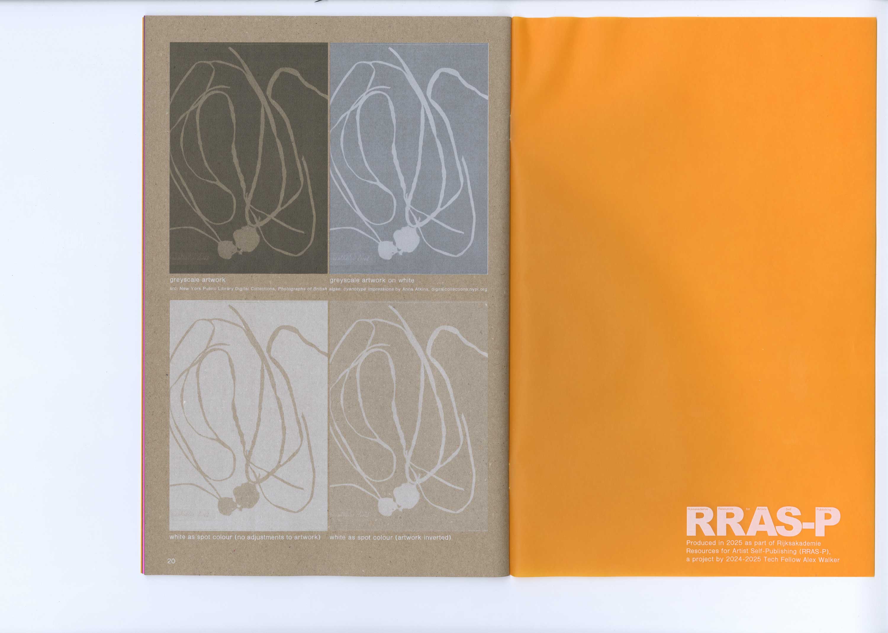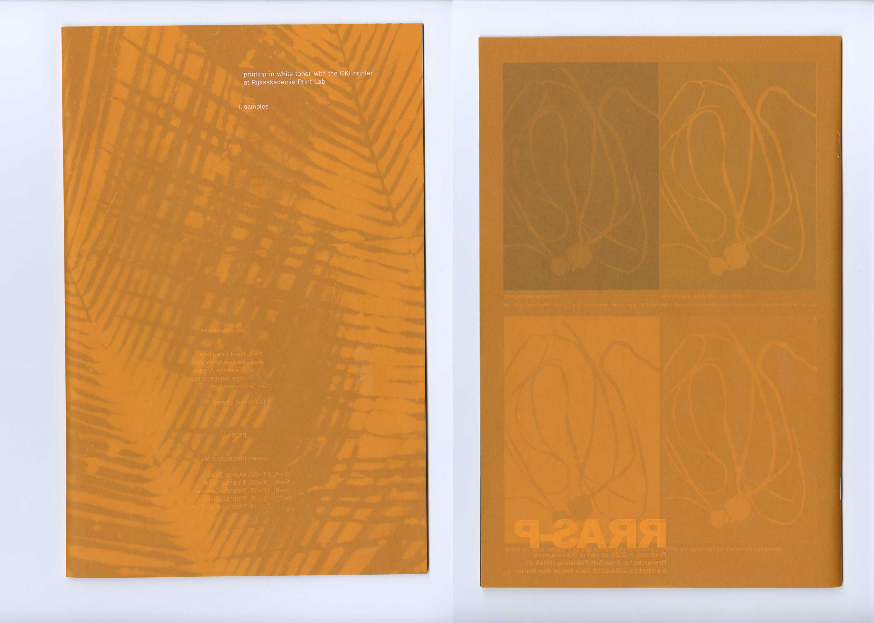 This side (A) is printed in red ink, and the other side (B) — is printed in grey ink, using a RISO MH9350 at the Rijksakademie Print Lab. You can observe that by printing both sides of the sheet in different inks results in a pattern of alternating colour across alternating spreads (2 pages in red followed by 2 pages in grey followed by 2 pages in red followed by 2 pages grey, and so on). This knowledge can also be applied to offset and digital printing, for example, to print half a book in black and half in full colour (CMYK) — as a more economical option than printing an entire book in full-colour. In printing terminology this is referred to as printing “4/1”, as opposed to “4/4” (printing full-colour or four inks on both sides of the sheet) or “1/1” (printing only black or a single spot colour on both sides of the sheet). A PDF can be downloaded here.