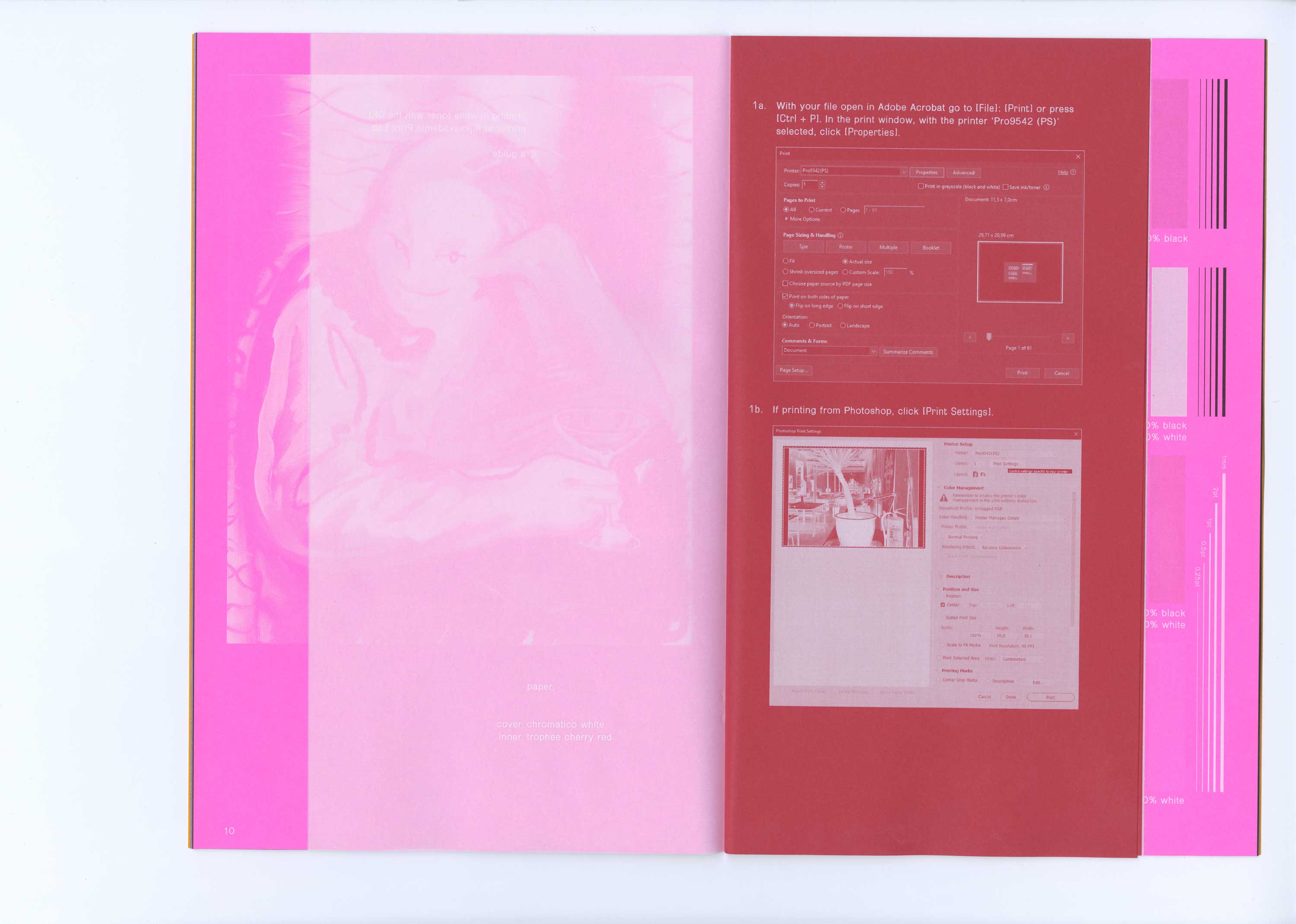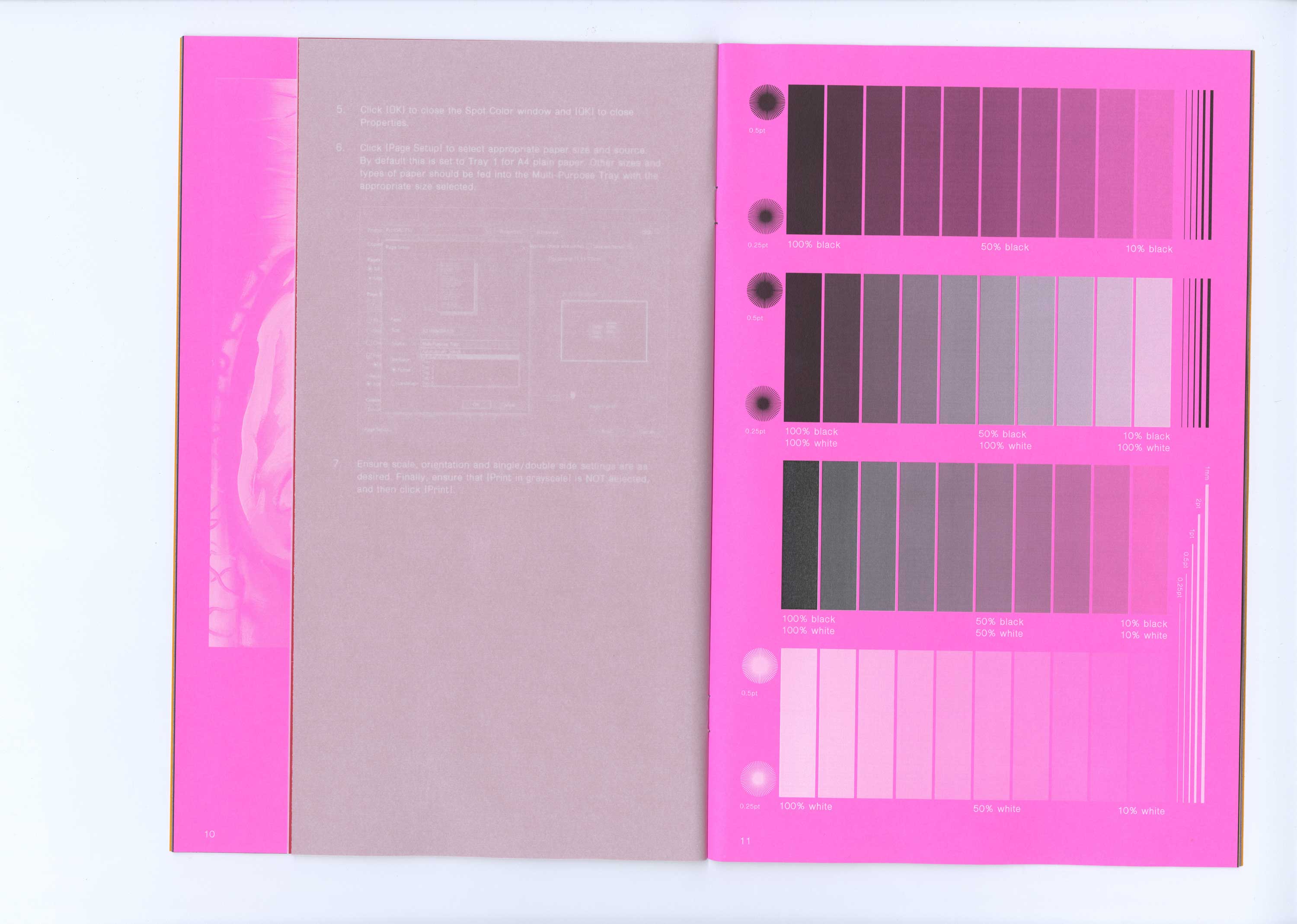 The most unique feature of this printer is the use of white toner. This can be used as a single spot-colour, or combined with black or CMYK in such a way that the white is used as a base layer to create a more opaque and vibrant print when used on a coloured or transparent stock. The guide and sample booklet I have produced shows examples of white as a single spot colour across a range of coloured papers, as well as a technical sheet showing white and black combined to show greyscales. A PDF of the guide booklet can be downloaded here.