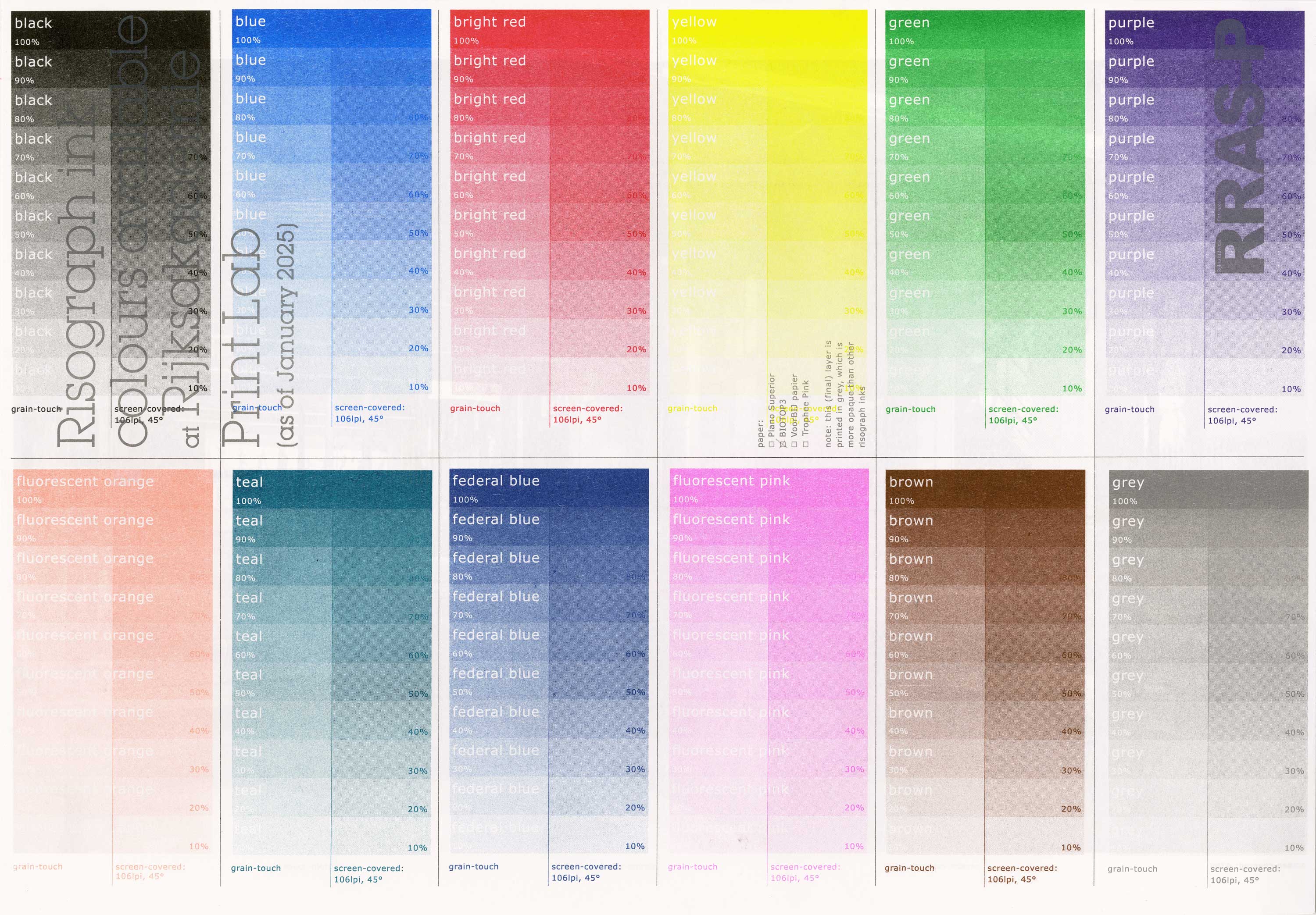 A risograph is a digital stencil printing machine that is useful for producing prints and publications in small–medium size editions (i.e. between 50–500 copies). It is often described as functioning like a cross between a photocopier and screen-printing, because it is fast and automated (similar to a copier), but prints in single ink layers through a stencil (similar to screen-printing). The Rijksakademie print workshop has a Risograph MH9350 which has two drums (meaning it can print two ink layers in a single pass) and prints A3 size with 12 possible ink colours. This A3 chart displays swatches of these 12 inks, each across a tone ladder in 10% increments. The reverse-side of the chart shows different halftoning options.