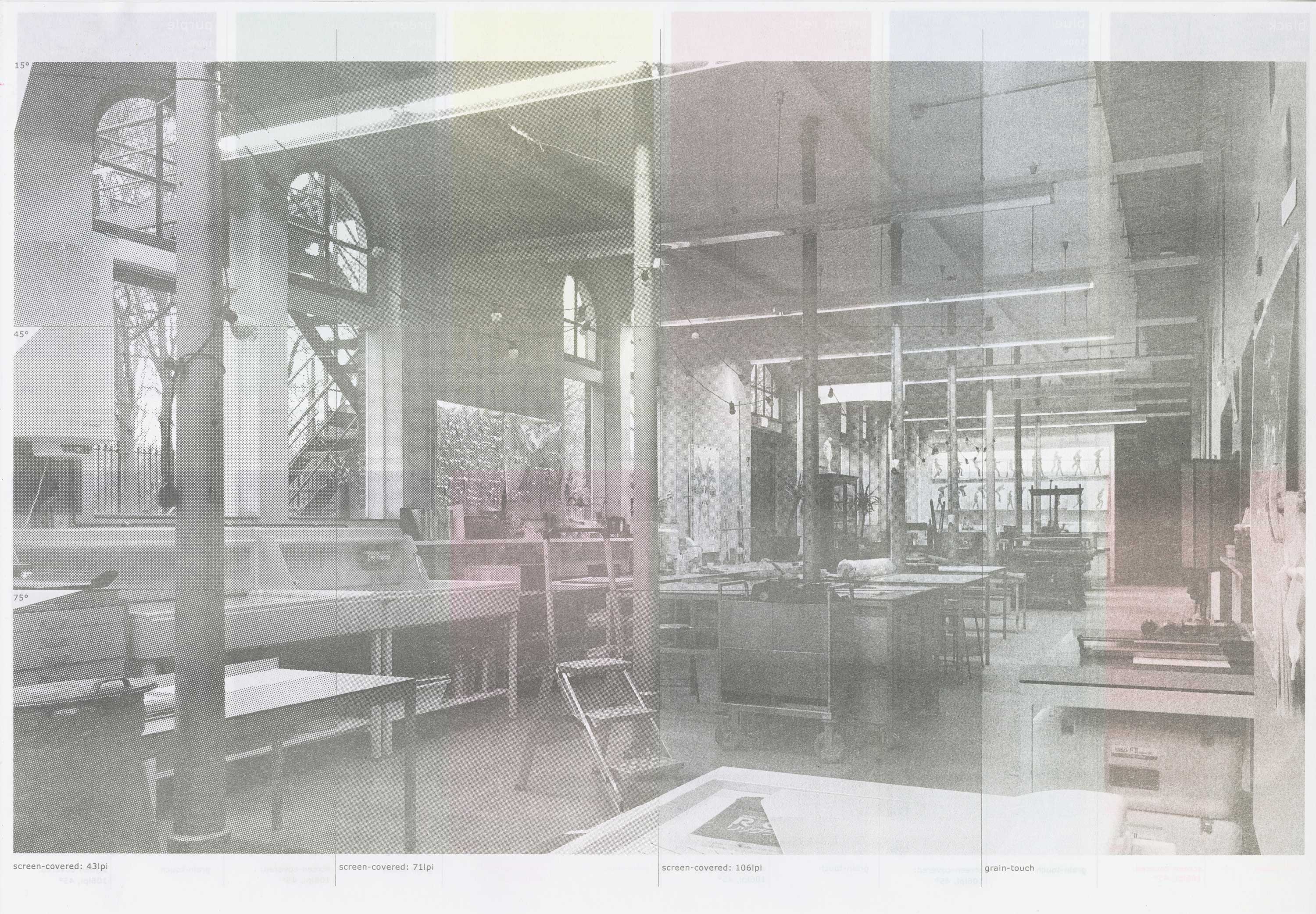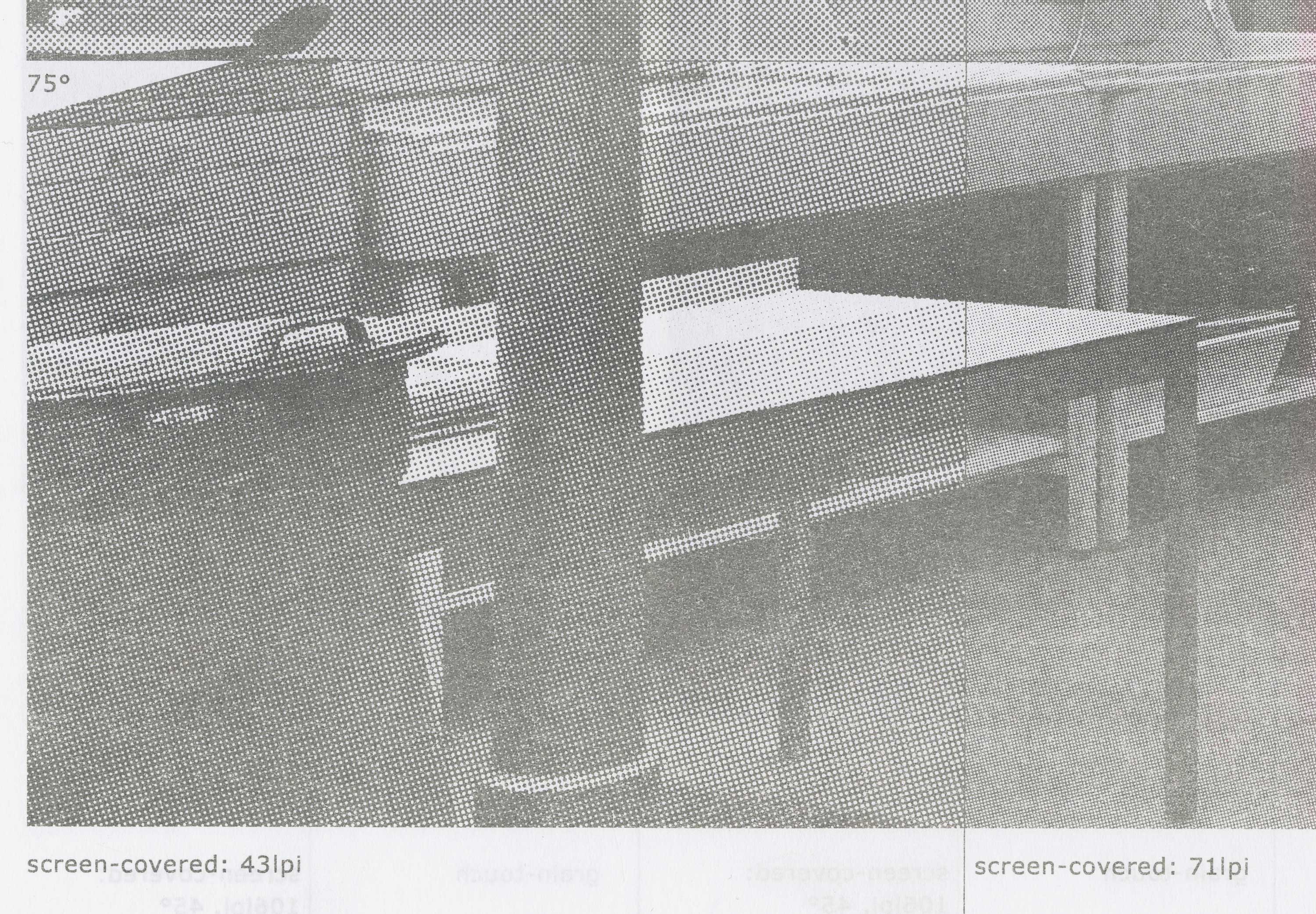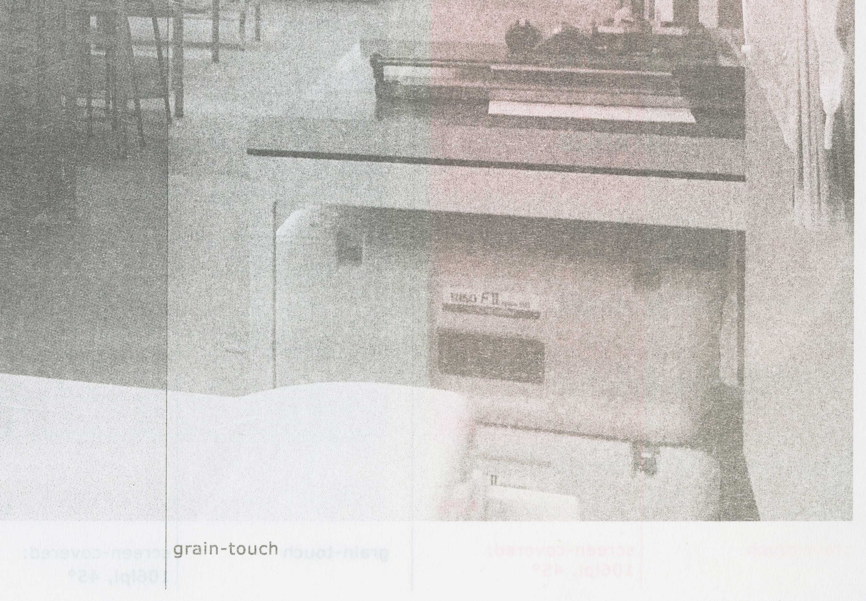 The risograph has a RIP (Raster Image Processor) that can halftone images in two different ways: screen-covered and grain-touch. Screen-covered (also known as "AM") is a grid composed of circular dots which vary in size depending on how dark the image is. Grain-touch (also known as "FM" or stocastic) is a random pattern, whereby darker areas of an image are more dense in noise.