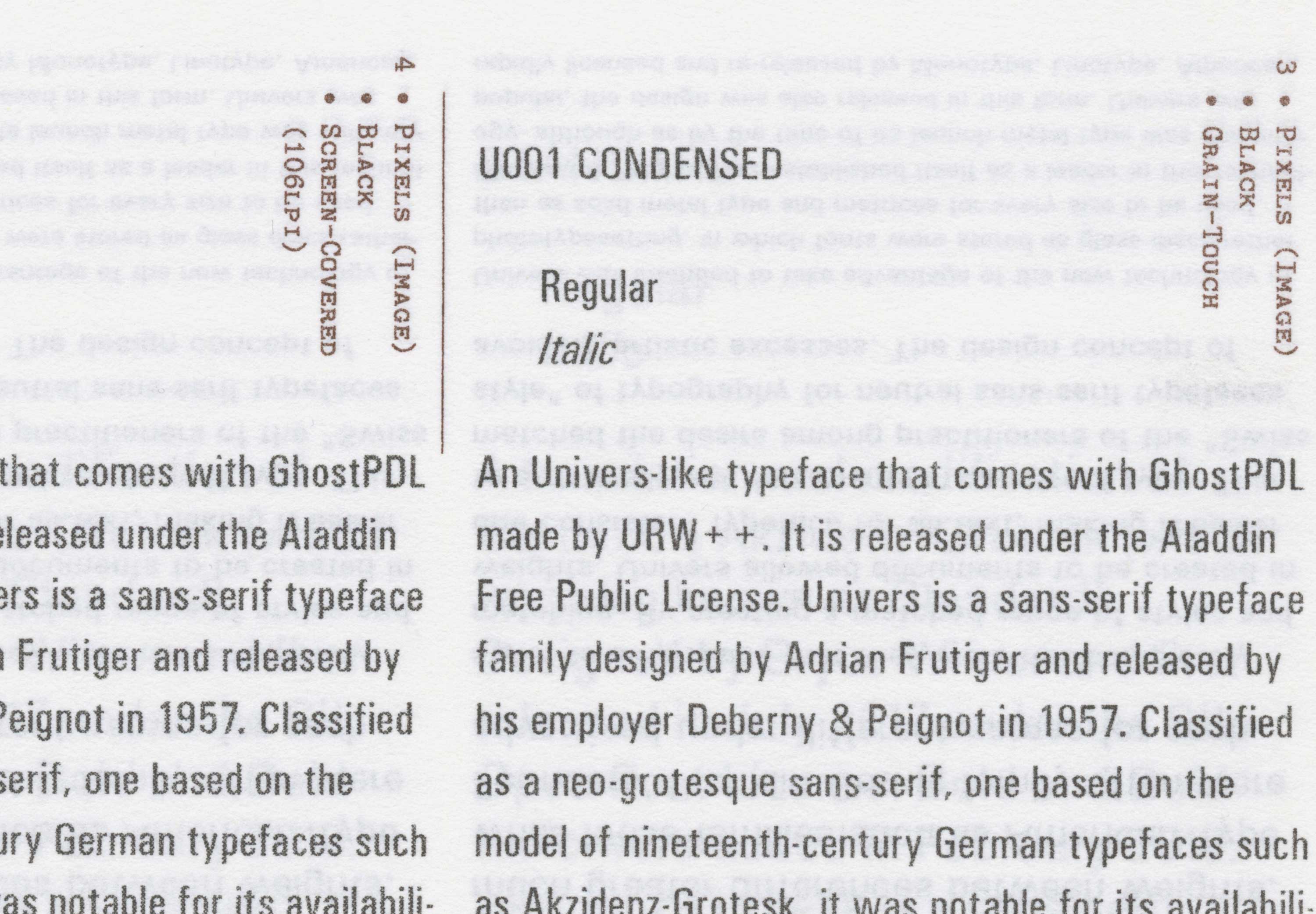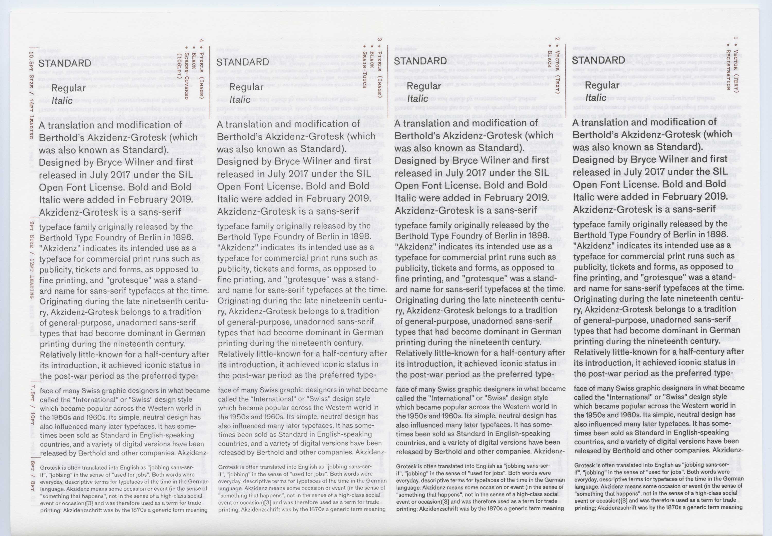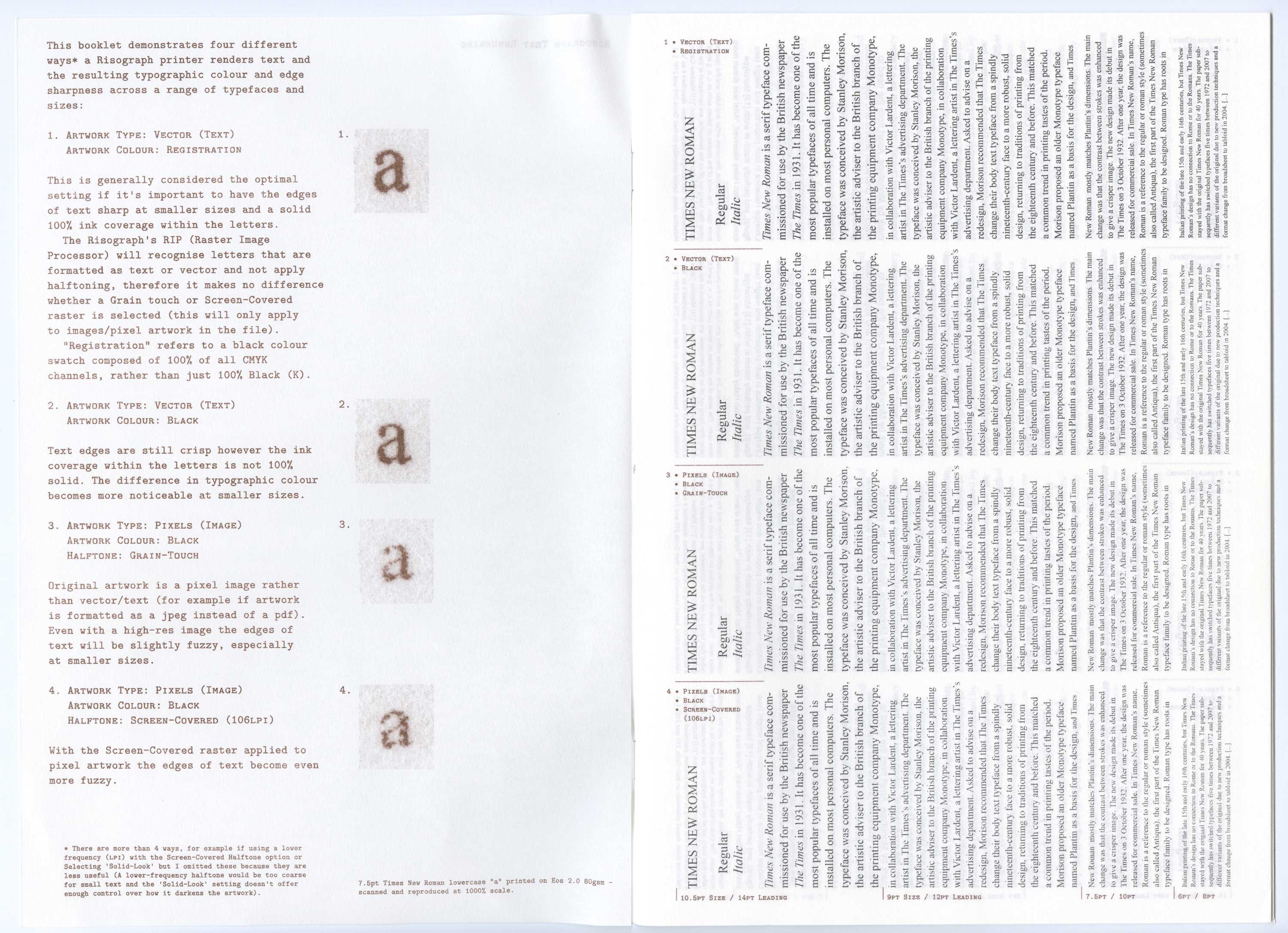 A guide to the different ways text can be rendered by a risograph, depending on artwork type (whether vector/text or image), artwork colour (whether black or registration) and halftoning choice (screen-covered or grain touch). These options are demonstrated across 16 typefaces and across 4 body-text sizes ranging from 10.5pt to 6pt. A print-ready pdf can be download here and a working file is coming soon.