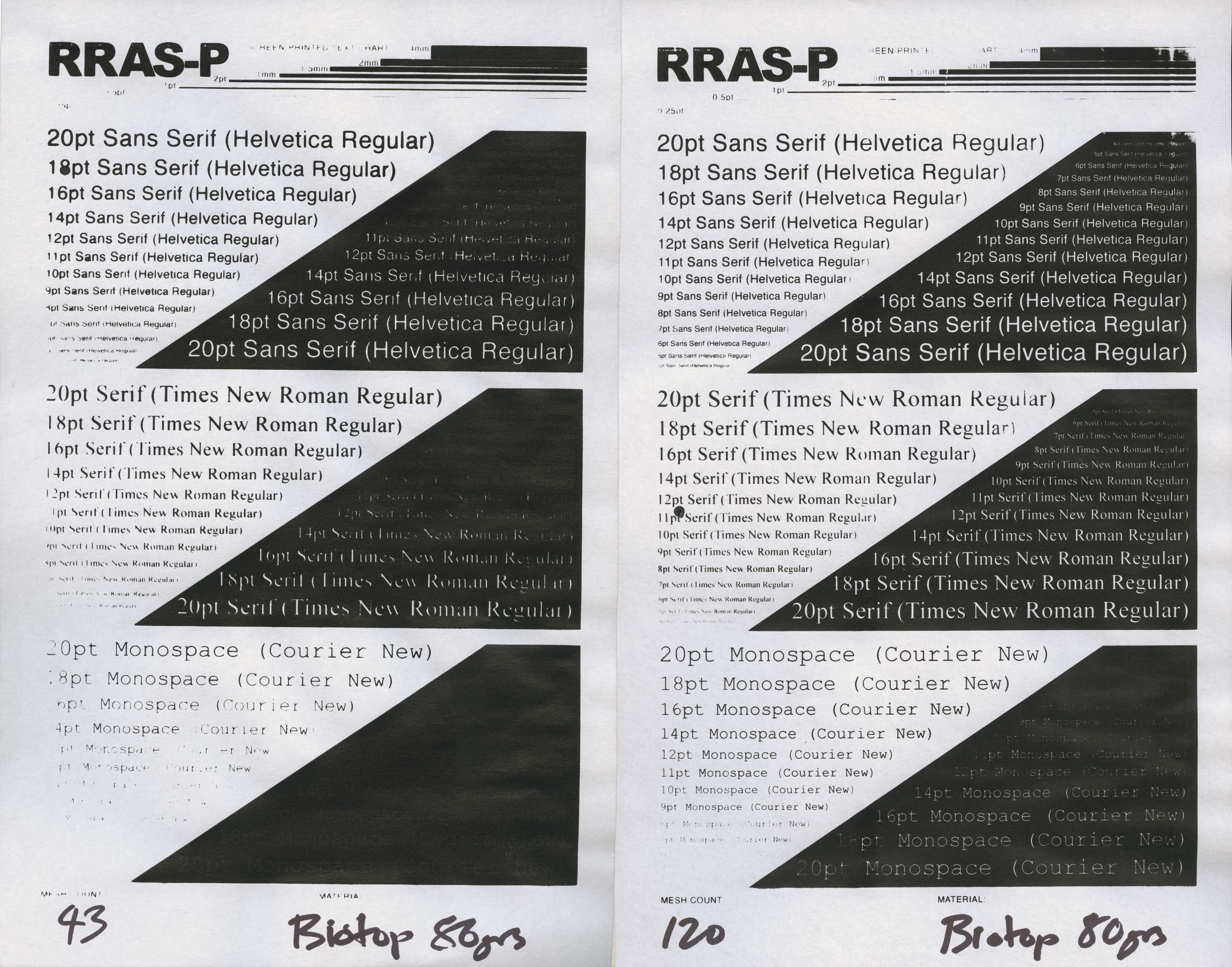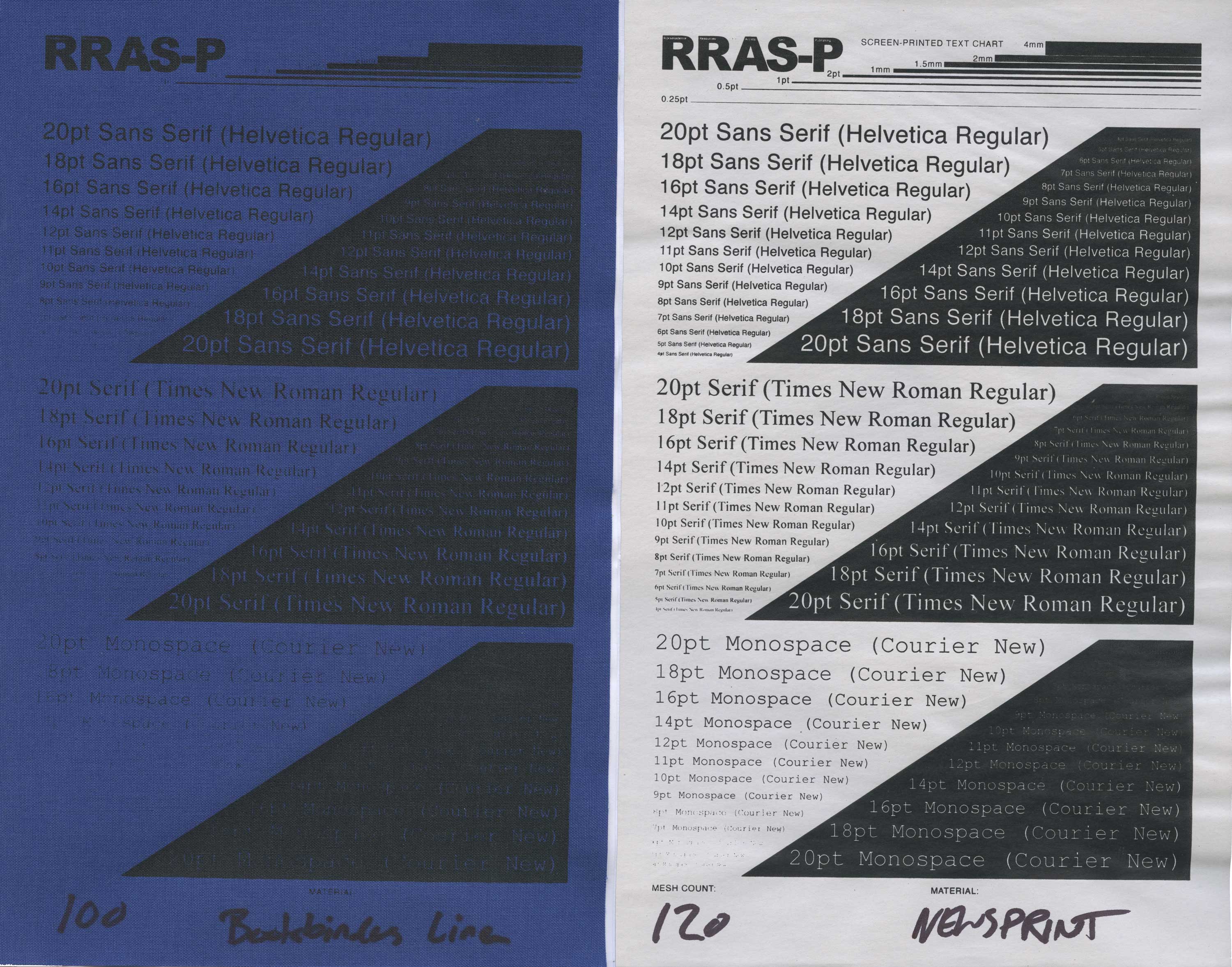 A text size chart screen-printed on a variety of different papers, board and bookbinders linen. Screens with three different mesh counts were used: 43, 100 and 120. A low mesh count (43) is a coarse mesh, primarily used for printing on textiles whilst a higher mesh count (100+) is used on paper and allows for finer detail to be produced. Whilst screenprinting is not a particularly efficient way to print pages of text for a publication, it is commonly used for book covers when unusual inks or cover material are required.